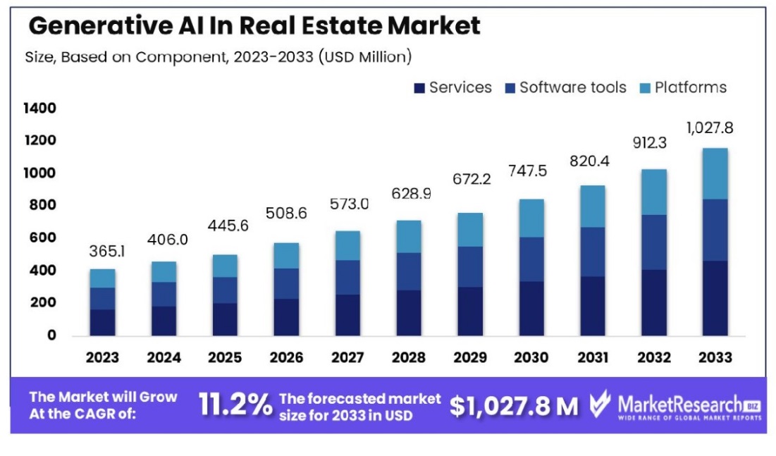 El mercado de la IA en el sector inmobiliario está experimentando un crecimiento significativo, con proyecciones que indican aumentos sustanciales en el tamaño y el valor del mercado en los próximos años. Para 2028, se espera que la IA en el mercado inmobiliario alcance un asombroso… 731.59 mil millones, demostrando una sólida tasa de crecimiento anual compuesta (CAGR). En el segmento más específico de IA generativa dentro del sector inmobiliario, el tamaño del mercado se valoró en 351.9 millones en 2022 y se proyecta que crezca a aproximadamente 1047 millones para 2032, con una CAGR del 11,52 % entre 2023 y 2032.2 Este crecimiento está impulsado por la creciente adopción de tecnologías de IA que mejoran la eficiencia de los procesos de ventas, marketing y operaciones en el sector inmobiliario.